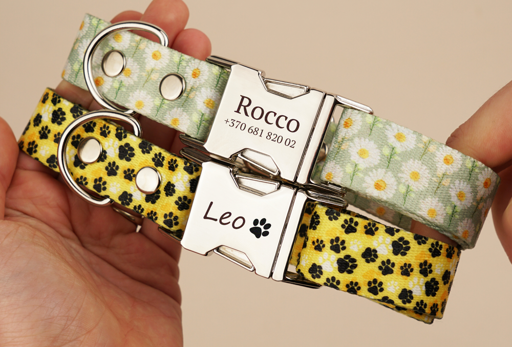 The metal buckle of the collar can be engraved with a laser, so the inscription will be durable and water resistant.
